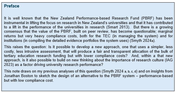 It’s those principles that drove my proposal, in my UAG submission (Smyth 2024d), for a possible reconfiguration of the PBRF. My focus has been on the design of a funding mechanism, a response to the emerging concerns about the financial and compliance costs of the current PBRF design.