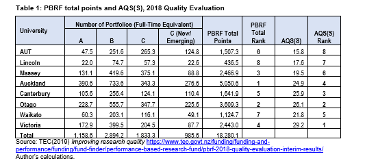 Victoria’s high rating on the AQS(S) measure isn’t because they have the highest proportion of A grades among its funded portfolios (that distinction belongs to Auckland, 22% of whose funded portfolios were graded A). Rather, it’s because they have the lowest number of unfunded portfolios – indeed, the data in the TEC’s report on the PBRF shows that Victoria has more funded portfolios than they have staff!