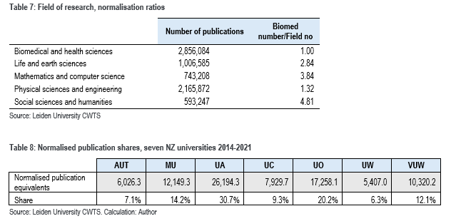 Therefore, we have applied a (crude) normalisation by the five broad fields of research displayed by Leiden University CWTS in its presentation of WoS data. The normalisation is crude because each of these broad fields summarises a large number of sub-fields; when CWTS does its normalisations (for instance of citations), they do a much more disaggregated analysis – see this page.
