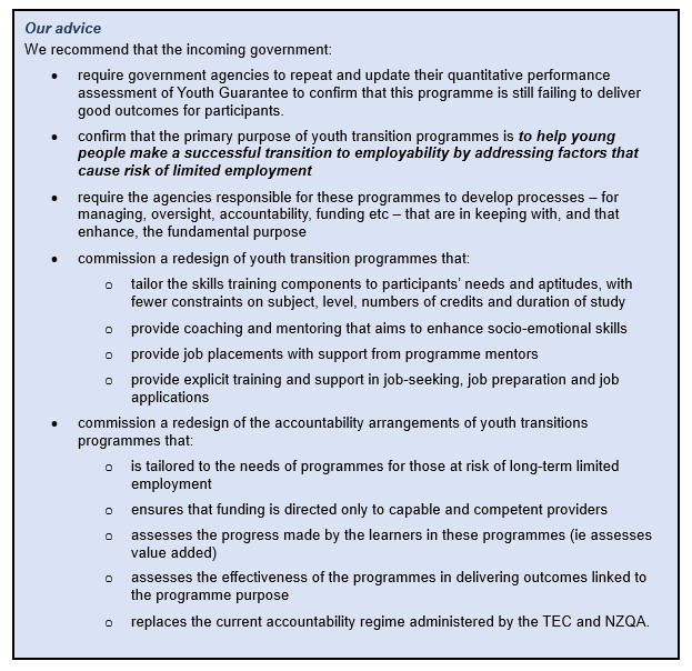 - require government agencies to repeat and update their quantitative performance assessment of Youth Guarantee to confirm that this programme is still failing to deliver good outcomes for participants.