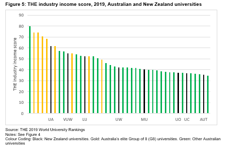 Figure 4 shows the performance of the eight New Zealand universities on that measure in the 2019 THE rankings, while Figure 5 puts those data alongside the scores of the 35 ranked Australian universities.