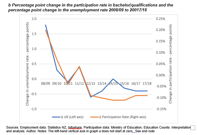 Figure 1 shows a close relationship between bachelors enrolments and the unemployment rate between 2008 and 2013. The change in the participation rate tracks the change in the unemployment rate very closely over that time. There is no sign of the one-year lag between changes in unemployment and enrolment levels in bachelors degrees observed in the 1990s recession; presumably, that is a consequence of the fact that secondary schools have maintained the very high retention to year 13 during the 2000s, meaning that a higher proportion of the cohort had the right to enter degree study.