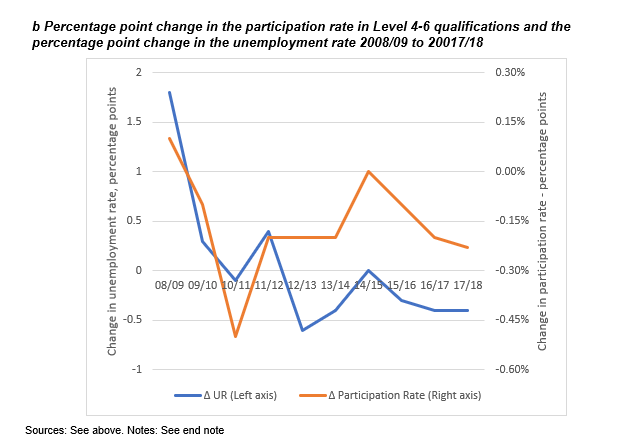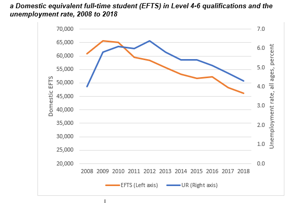Figure 2: The relation between enrolment in qualifications at Levels 4-6 and the unemployment rate through the GFC and beyond