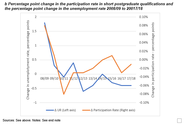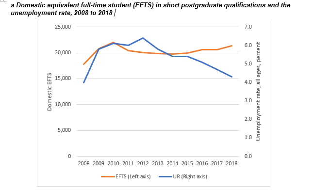 Figure 3: The relation between enrolment in short postgraduate qualifications and the unemployment rate through the GFC and beyond