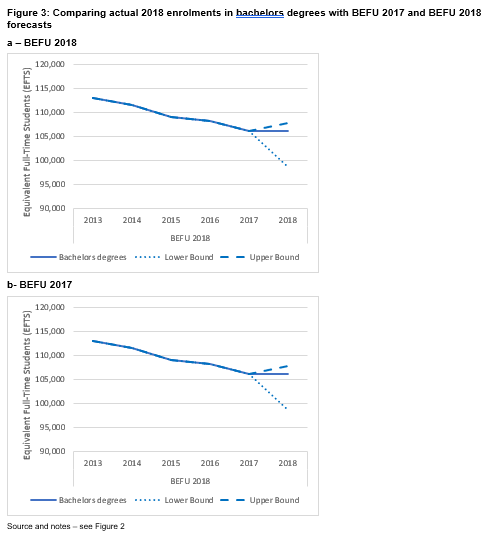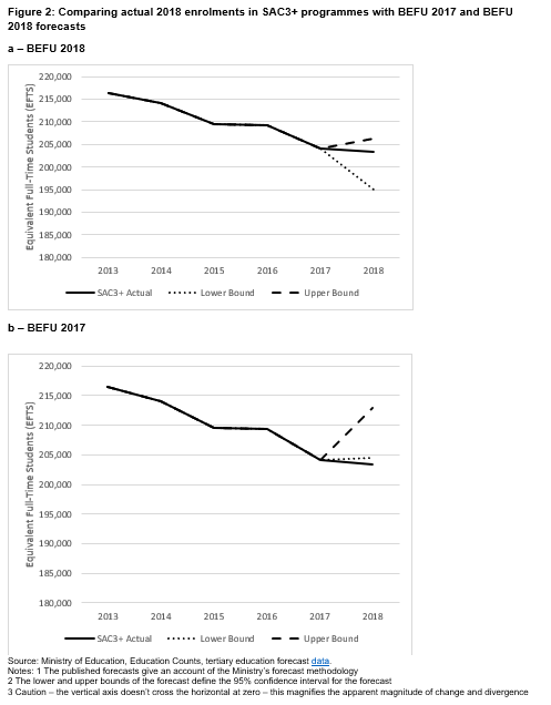 Figures 2 and 3 below set out the results of the comparison between actual SAC3+ enrolments and those two forecasts.