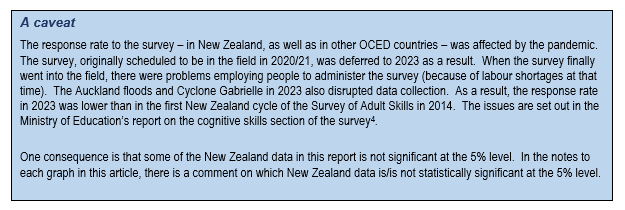 Nearly all countries had lower response rates to the 2023 cycle of the Survey of Adult Skills as a result of the pandemic. In part that was due to the way the pandemic affected people’s attitudes and behaviours[7]. In this country, those impacts were exacerbated by the challenge of recruiting survey administrators in a very tight labour market in 2022/23 and by two natural disasters in early 2023[8].