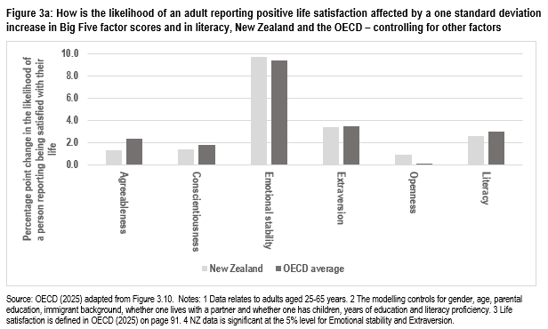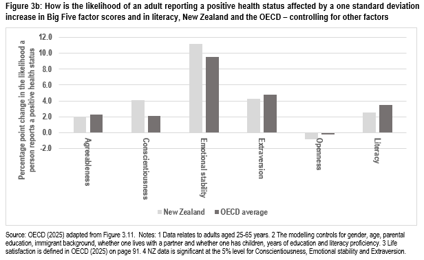 It’s that third part that I look at in this article. I look at the data for New Zealand on employment, earnings, life satisfaction and self-reported health status and I compare how differences in New Zealand respondents’ social and emotional skills affect those outcomes, taking account of respondents’ educational attainment, literacy, gender, age, and other background variables – and I compare that with the OECD average and with a small set of comparator countries.
