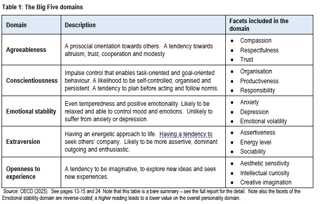 We know that employers want to recruit people who have social and emotional skills: Careers NZ reports that there are seven “essential employability skills” including having a positive attitude, self-management, a willingness to learn and resilience. Those don’t have a precise mapping to the Big Five domains but they overlap.