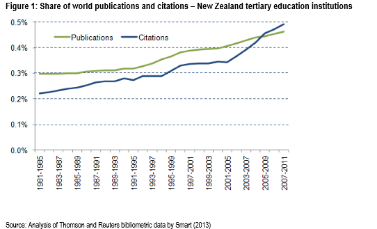 - the New Zealand tertiary education system’s share of the world’s scientific/research publications indexed in the Web of Science[2]