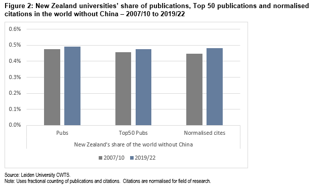 And while the number of Top50 publications from NZ universities grew between 2007/10 and 2019/22 and the share of the world Top50 publications grew, the proportion of Top50 publications actually fell, dropping to just under 50% — the expected level for a system performing at world standard. Sure, it’s only one indicator but we need to watch that it is not early warning of a shift towards the prioritisation of quantity over quality.