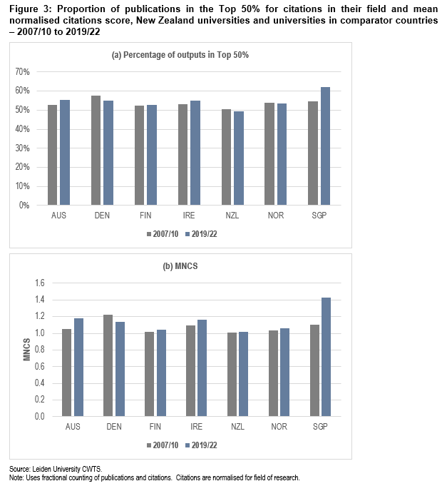Figure 3 looks at the change in the MNCS and in the proportion of publications in the Top 50% over that time, in New Zealand and those other countries (noting that these two measures are scale independent).