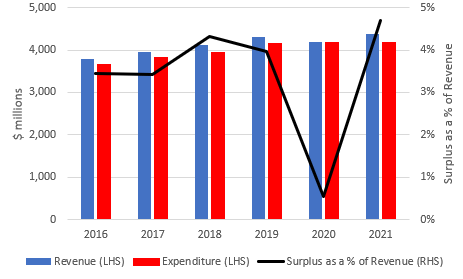 Figure 3: University system revenue and expenditure and operating surplus as a percentage of revenue 2016-2021