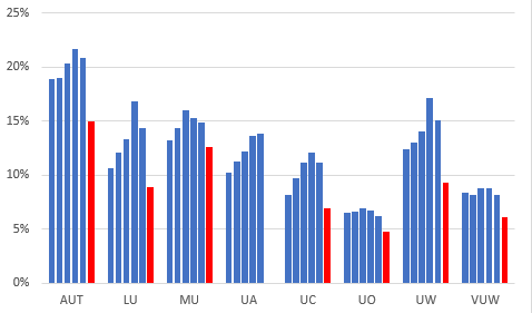 Figure 5: University operating surplus as a percentage of revenue 2016-2021 – data for the years affected by the pandemic (2020 and 2021) in red