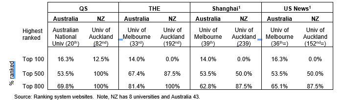 Table 1: Performance in the most recent releases in selected university rankings systems – Australian and New Zealand university systems – highest ranked university and the proportion of each country’s universities that are ranked