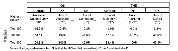The UK has a lower proportion of its universities in the top 800 than either Australia or New Zealand, but, like Australia and unlike NZ, it has a set of elite universities.