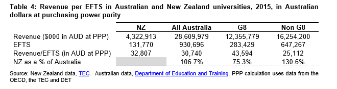 Table 4: Revenue per EFTS in Australian and New Zealand universities, 2015, in Australian dollars at purchasing power parity