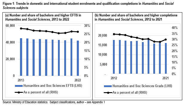 The Listener story also refers to an article with a similar theme in the New York Times. Paul might have referred (but didn’t) to many other similar views from other countries – for instance, recent reports from the British Academy and the Royal Historical Society on the decline of university enrolments in the UK in English and History. Or to the two reports from the Higher Education Policy Institute on the challenges facing the humanities in British universities. Or to the data on trends in field of study in Canadian and Australian tertiary education ….. or to data from any one of a number of other Anglosphere countries.