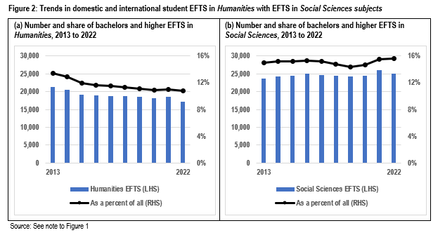 Figure 2 compares the EFTS count and share in Humanities with that in Social Sciences.