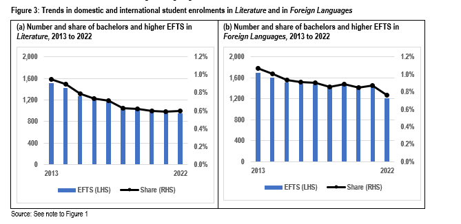 Figure 3 speaks for itself. Literature EFTS fell by 37% over the period while Literature graduate numbers fell by 45%. For Foreign Languages, the falls were 28% in EFTS and 30% in graduate numbers.