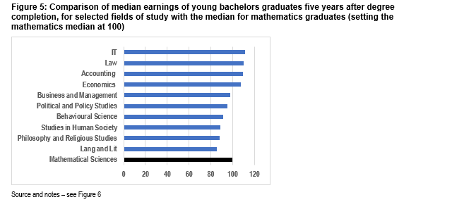 Focusing only on those whose principal destination is employment, there are also differences between these fields in the earnings of graduates. Figure 5 below looks at the relative earnings five years after completion of bachelors graduates who are in employment, with same selected fields of study as Figure 4.