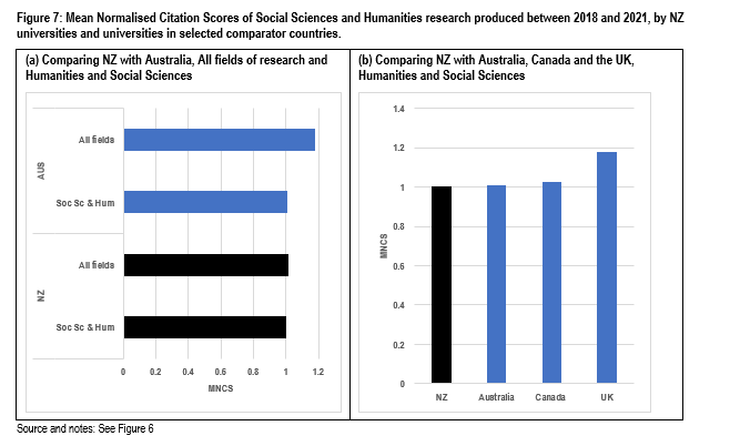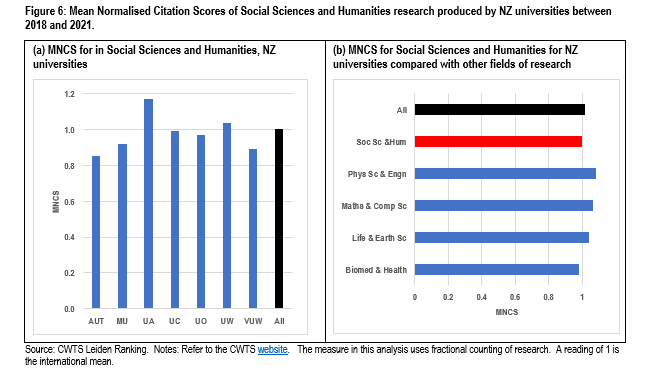 [20] The interpretation of the MNCS in Humanities and Social Science needs to acknowledge that much research is culturally linked to its region of origin, which may have a depressing effect on the score in NZ – a small country far from the larger countries in the global north. In that context, a national MNCS of 1.00 is a good result.