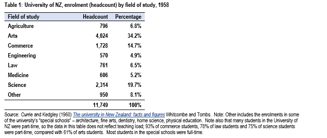 Enrolment data from the University of New Zealand in 1958 shows that arts attracted the largest group of students: