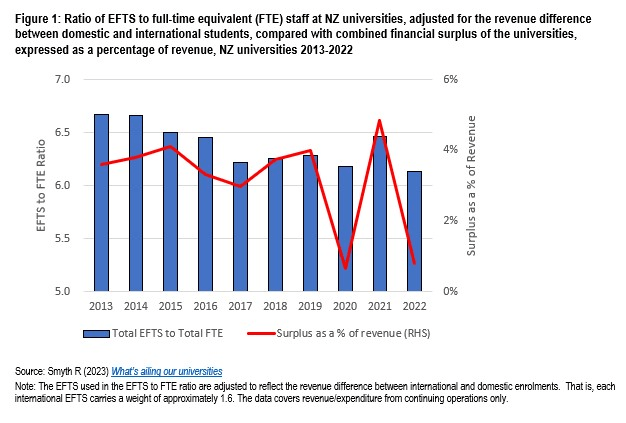 One predictor of institutional efficiency is the ratio of students to staff – total EFTS, domestic and international, to total FTE staff, academic and professional. On this measure, 2022 gives the lowest reading in 20 years.